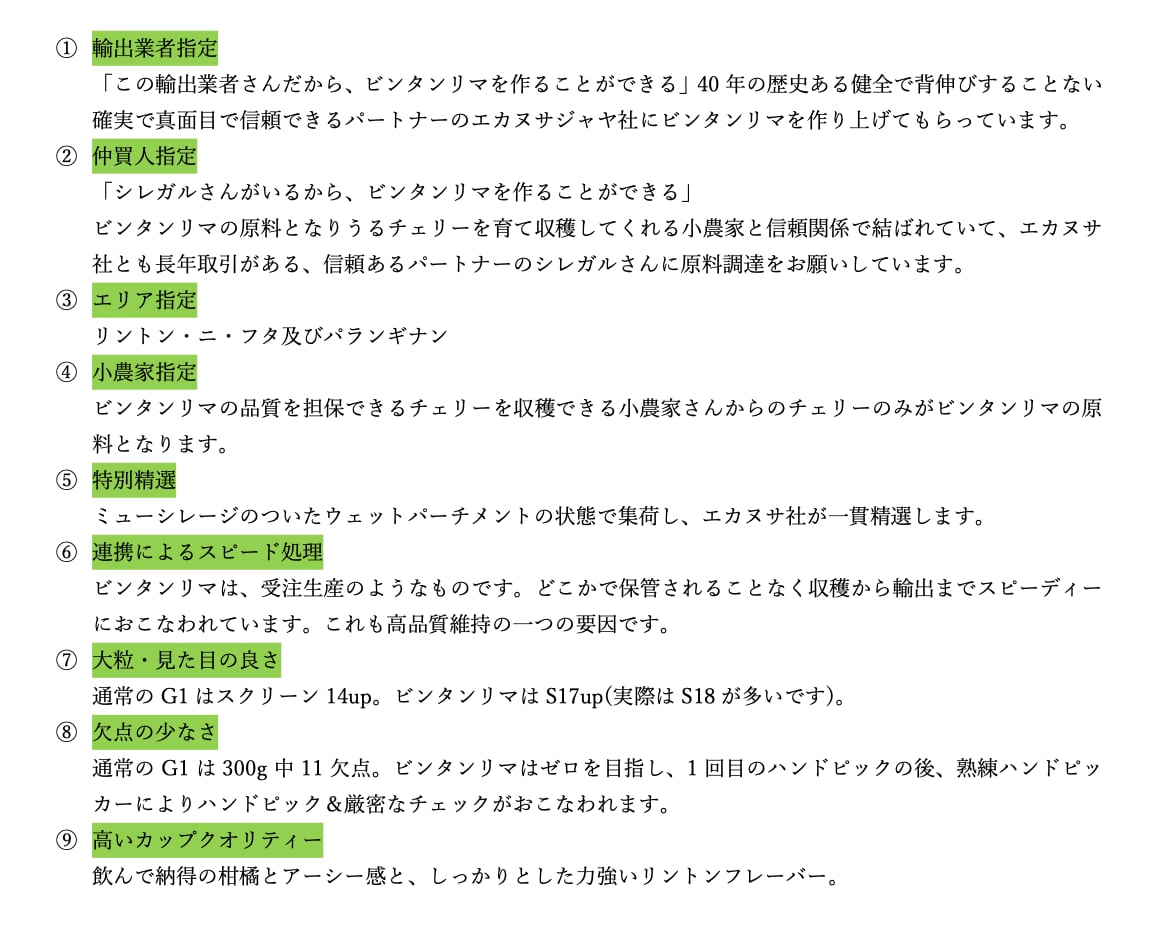 インドネシア スマトラ島北中部のトバ湖周辺のマンデリンコーヒーを生産する地区の中でもエリアをリントン ニフタ及びパランギナンに限定して、その生産を信頼できる輸入業者さん、仲買人さん、さらに小農家さんまで指定して一貫管理しています。そのため収穫、精製、乾燥、選別、輸出まで全ての行程をスピーディーで品質良く仕上げることができます。